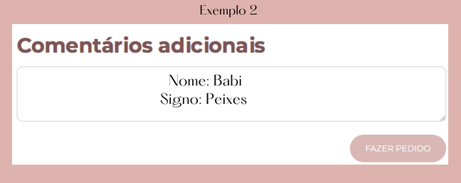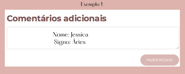 Insira seu nomee signo no no final do pedido no campo escrito "Comentário Adicionais ", veja foto com exemplos abaixo: